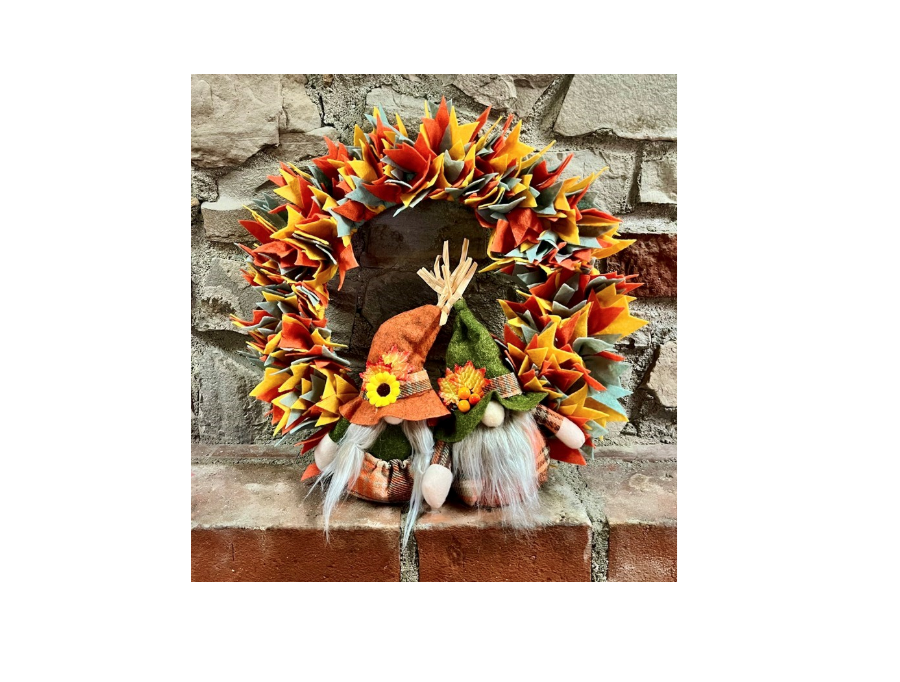 Welcome the spirit of autumn into your home with this charming handmade fall wreath, bursting with rich hues of orange, golden yellow, and soft teal felt leaves. At the heart of the wreath, a sweet gnome couple dressed in festive plaid and adorned with seasonal accents like sunflowers and berries brings a whimsical touch of warmth and harvest cheer. Perfect for your front door or mantel, this handcrafted wreath is a delightful way to celebrate the cozy, colorful season of fall.