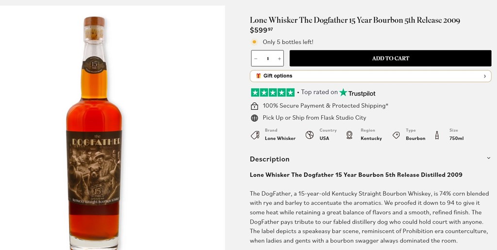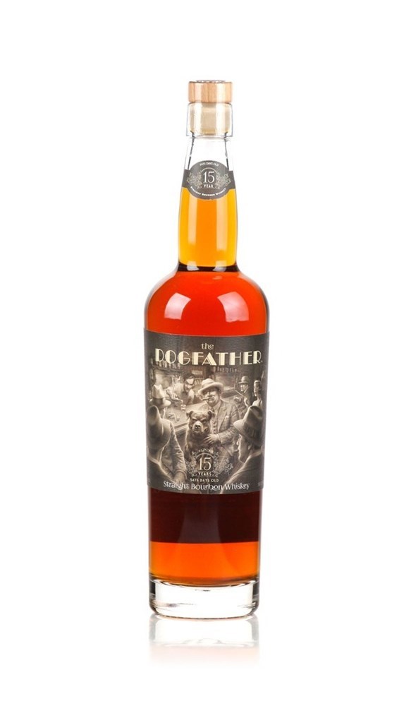 The Dogfather 15 yr Kentucky Straight Bourbon (one bottle $695) The DogFather, a 15-year-old Kentucky Straight Bourbon Whiskey, is 74% corn blended with rye and barley to accentuate the aromatics. We proofed it down to 94 to give it some heat while retaining a great balance of flavors and a smooth, refined finish. The DogFather pays tribute to our fabled distillery dog who could hold court with anyone. The label depicts a speakeasy bar scene, reminiscent of Prohibition era counterculture, when ladies and gents with a bourbon swagger always dominated the room.