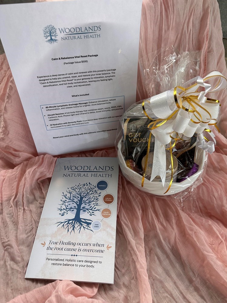 You a receive a Calm & Reset Package from Woodlands Natural Health! A $500 value! Experience a deep sense of calm and renewal with this powerful package designed to help you unwind, reset, and restore your inner balance. The “Calm & Rebalance Vital Reset" is your gateway to relaxation, lymphatic detoxification, and full-body revitalization, leaving you feeling light, clear, and rejuvenated. What's Included 45-Minute Lymphatic Drainage Massage: Enhance circulation, reduce inflammation, and release toxins for a lighter, more balanced body. Hocatt Session: A full-body therapy that combines steam, ozone, PEMF, FSM, Carbonic Acid, Photon light and infrared to detox, boost immunity, and promote relaxation. IV Hydration with Serenity Push: Experience deep relaxation with our speciall formulated IV to calm the mind and body. Reset your mind and body with this ultimate relaxation experience!